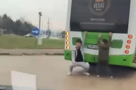 Bursa'nın Yıldırım ilçesi Millet Mahallesi’nde iki çocuk, oyun sandıkları tehlikeli bir macera için otobüsün arkasına tutundu.