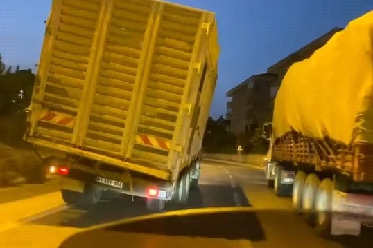 Kamyonun bu tehlikeli yolculuğu, trafikteki diğer sürücüleri paniğe sürükledi. Yan yatmış haldeki kamyonu gören vatandaşlar, olası bir kazadan endişe duyarak durumu cep telefonlarıyla kaydetti.