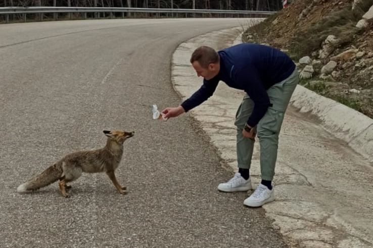 Yanında yiyecek olmadığı için tilkinin ayranla susuzluğunu gideren vatandaş o anları kamerası ile çekerek kayda aldı.