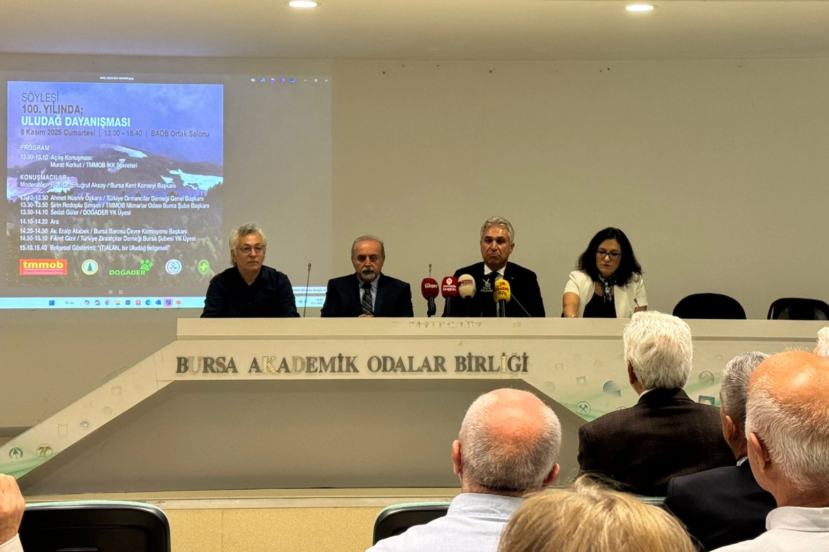 Ziraat Mühendisleri Odası Bursa Şube Başkanı Fevzi Çakmak moderatörlüğünde gerçekleşen söyleşide; Türkiye Ormancılar Derneği Genel Başkanı Hüsrev Özkara, TMMOB Mimarlar Odası Başkanı Şirin Rodoplu Şimşek, DOĞADER Yönetim Kurulu Üyesi Sedat Güler, Bursa Barosu Çevre Komisyonu Başkanı Av. Eralp Atabek ve Türkiye Ziraatçılar Derneği Bursa Şubesi Üyesi Fikret Gizer gibi isimler, Uludağ’ın korunması, sürdürülebilirliği ve ekolojik dengesi üzerine değerlendirmelerde bulundu.