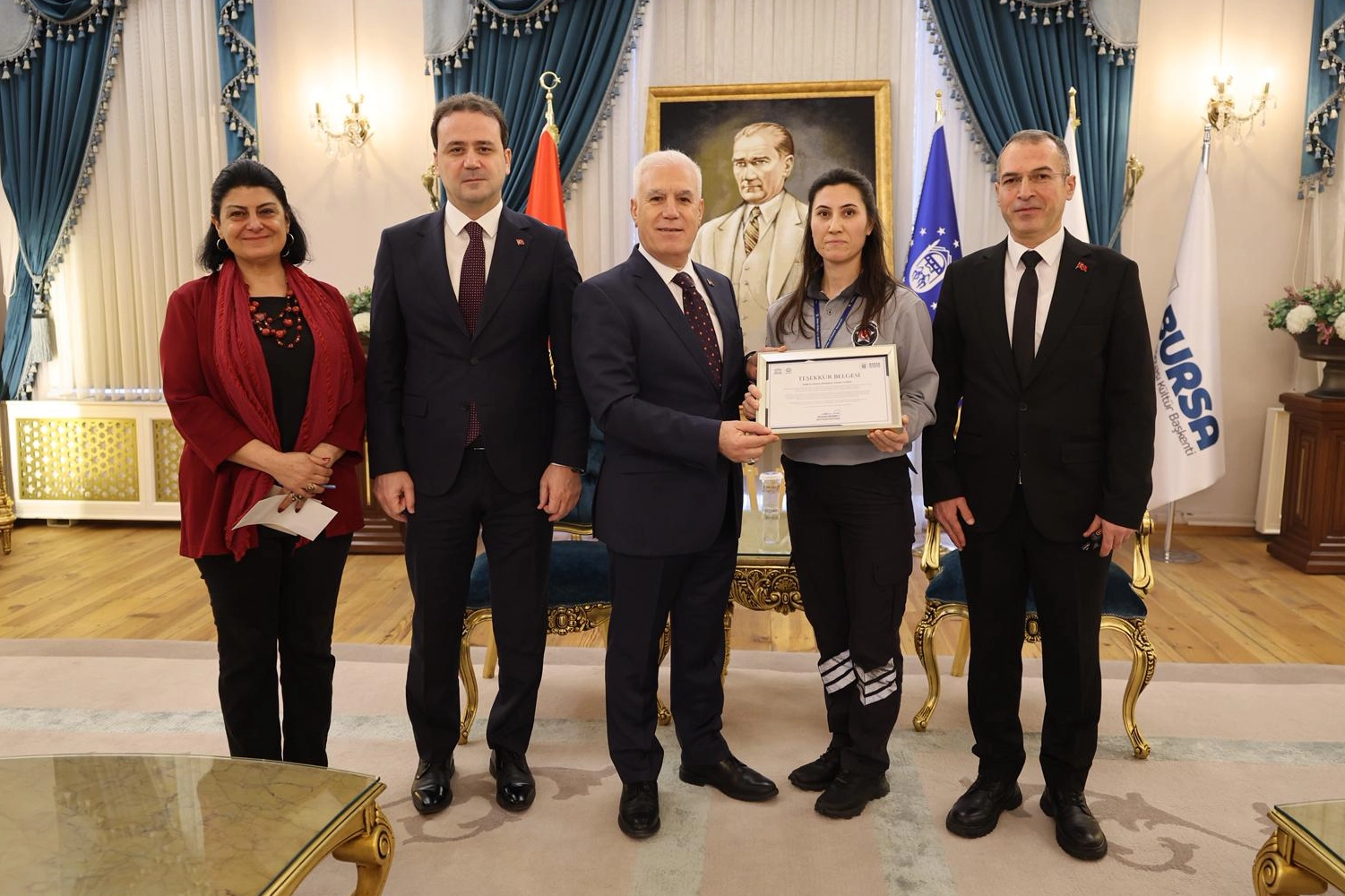BAŞKAN BOZBEY’DEN TEŞEKKÜR BELGESİBüyükşehir Belediye Başkanı Mustafa Bozbey, Fatma Yılmaz’ı Tarihi Belediye Binası’nda ağırlayarak teşekkür belgesi takdim etti. Başkan Bozbey, Yılmaz’ın vatandaşa yaklaşımını ve çalışma arkadaşlarına verdiği geri bildirimleri örnek göstererek şunları söyledi: