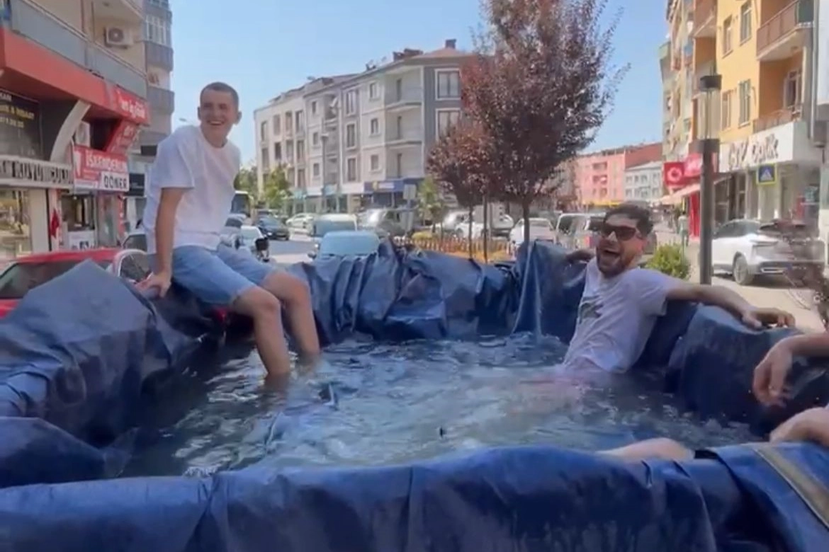 Mahalle sakinlerinin hem şaşkın hem de gülümseyen bakışları arasında gerçekleşen bu mobil havuz turu, sıcak havada serinlemek için sıra dışı bir yöntem olarak yorumlandı.