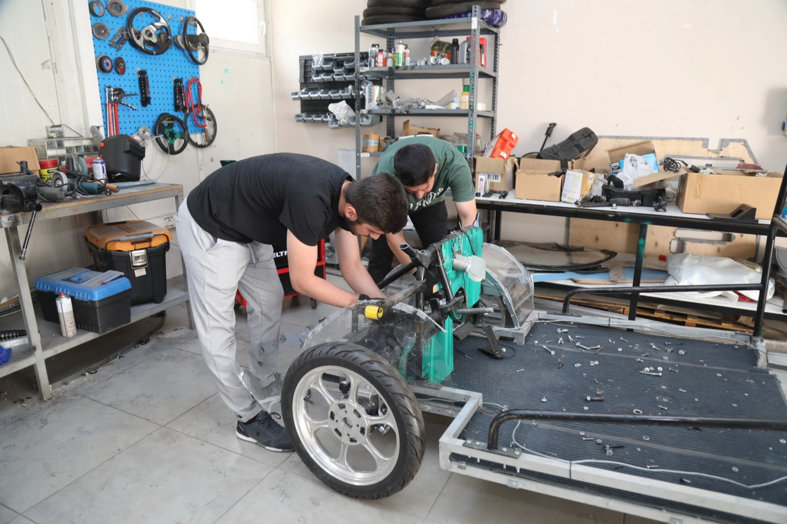 "HER ZAMAN YANINIZDAYIZ, YETER Kİ ÜRETİN"TEKNOFEST Havacılık, Uzay ve Teknoloji Festivali çerçevesinde düzenlenen yarışmalara Bursa Teknik Üniversitesi (BTÜ) büyük bir başarı ile katılıyor. Üniversite, 10 farklı kategoride 15 takım ile finale kalmayı başardı. Finalist takımlar, bu yıl da derece elde edebilmek için üniversitenin atölyelerinde 7/24 çalışma temposu ile hazırlıklarını sürdürüyor. Uluslararası Efficiency Challenge Elektrikli Araç Yarışları'na en iyi elektrikli araçlarla katılmak isteyen öğrencileri desteklemek amacıyla BTÜ Rektörü Prof. Dr. Naci Çağlar, Rektör Yardımcısı Prof. Dr. Beyhan Bayhan ve Teknoloji Yarışmaları Koordinatörü Prof. Dr. Hüseyin Lekesiz, Yıldırım Bayezid Yerleşkesi'ndeki atölyeleri ziyaret ederek öğrencilerle bir araya geldi.