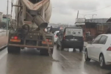 Trafikte seyir halinde olan beton mikseri, arkasına beton dökerek ilerledi.