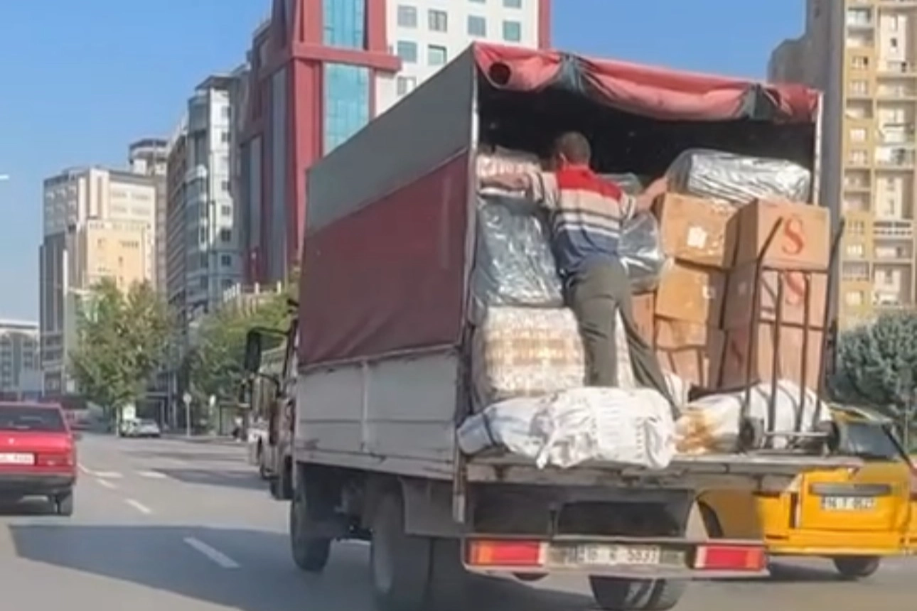 Kamyonetin kasasında eşyaları tutan vatandaşı gören sürücüler gözlerine inanamadı.