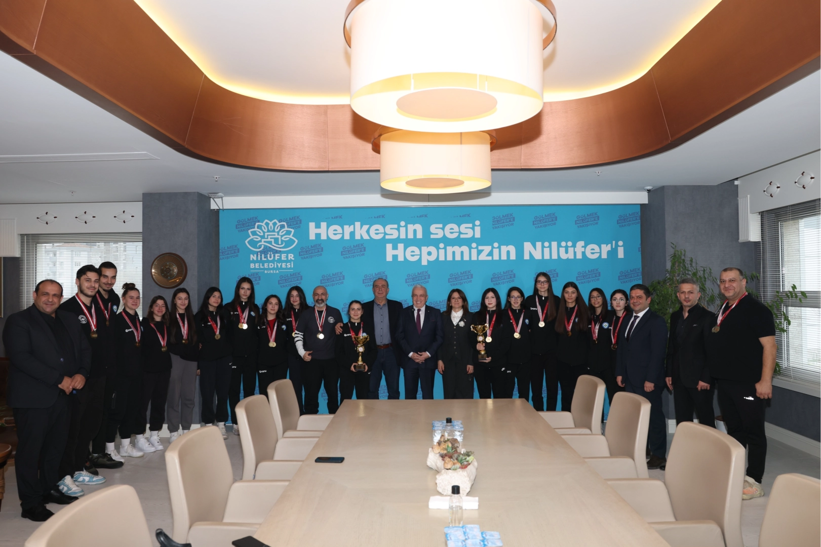 Nilüfer Belediyesi Halk Evi’ndeki başkanlık makamında gerçekleşen ziyarete, Nilüfer Belediyespor Kulübü As Başkanı Mehmet İlker Şener, kulüp yöneticileri, teknik ekip ve şampiyon sporcular katılım sağladı.