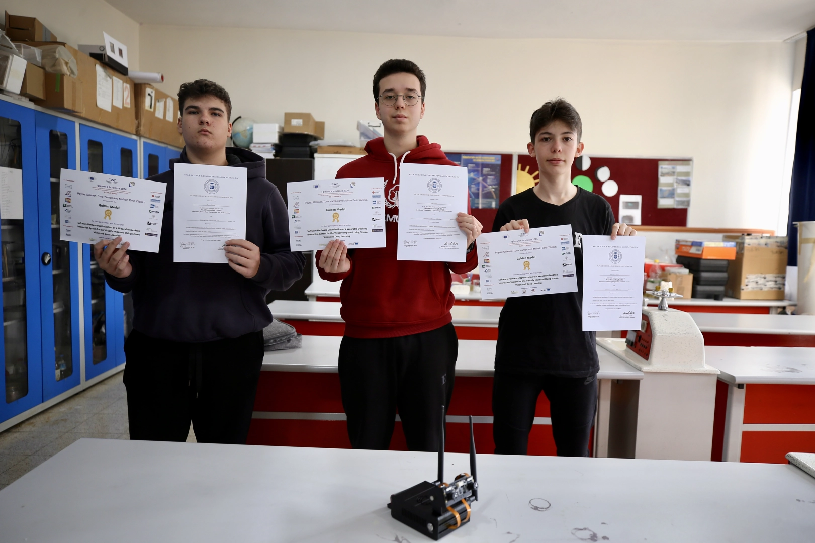 "50 bireyimiz bize 5 üzerinden puan verdiler. Toplamda 4,6'lık güzel bir puan aldık. Ben bu projenin test ve yapay zeka geliştirme bölümünde görev aldım. Yapay zeka, cihazın önündeki objeleri görmesinde destek sağlıyor. Projemize güveniyorduk, altın madalya bekliyorduk fakat Yale Üniversitesi'nin verdiği özel ödülü hiç beklemiyorduk. Cihaz üzerindeki geliştirmelerimiz devam edecek. Sistemi daha farklı kamera tipleriyle, daha iyi çalışan yapay zeka sistemleriyle ve daha farklı sistemlerle birlikte geliştirmeyi planlıyoruz."
