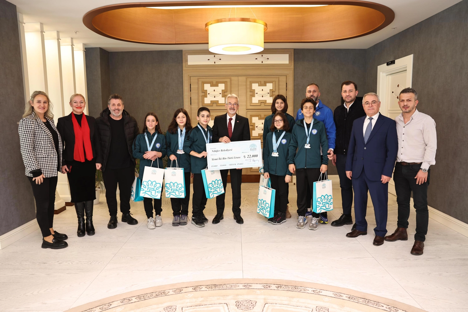Çok sayıda dereceyle Nilüfer’i gururlandıran Nilüfer Belediyespor’un başarılı sporcuları, Nilüfer Belediye Başkanı Turgay Erdem’i Halk Evi’ndeki makamında ziyaret ederek sevinçlerini paylaştı. Nilüfer Belediye Başkan Yardımcısı Dr. Sibel Özer, Nilüfer Belediye Meclisi Üyesi Mustafa Şenyurt ile Nilüfer Belediyespor Yüzme Branşı Koordinatörü Durak Gültaş’ın da yer aldığı ziyarette Başkan Turgay Erdem, genç yüzücüleri başarılarından dolayı kutladı. Sporcuya verilen değerin karşılığını başarılarla aldıklarını belirten Başkan Turgay Erdem, Türkiye Yüzme Federasyonu 11 Yaş Ulusal Gelişim Projesi Ligi Türkiye Finali’nde dereceye giren sporcuları ödüllendirdi.