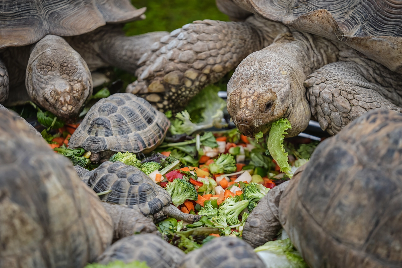 AFRİKA KAPLUMBAĞALARINA ÖZEL DİYETHayvanat bahçesinde bulunan 9’u yetişkin, 6’sı yavru toplam 15 Afrika kaplumbağası, soğuk havalarda tamamen iç mekanlarda barındırılıyor. Bakıcı Ergün Kula tarafından titizlikle hazırlanan günlük öğünlerde; kavun, karpuz, elma, marul ve havuç gibi sebze-meyvelerin yanı sıra besleyici yonca takviyeleri kullanılıyor. Kaplumbağalar, metabolizmalarını korumak adına sadece çok güneşli günlerde kısa süreliğine dış ortama çıkarılıyor.
