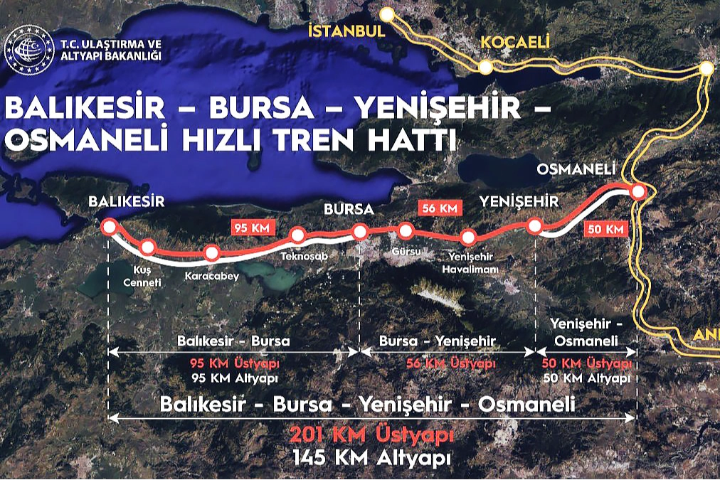 BURSA'DAN ANKARA VE İSTANBUL 2 SAAT 15 DAKİKA OLACAKBu hattın 2025 yılı sonunda Bursa-Osmaneli kesimiyle, 2028 yılında ise Bandırma-Bursa hattının hizmete gireceği belirtildi. Tamamlandığında, Ankara-Bursa ve Bursa-İstanbul arasında seyahat süresi yalnızca 2 saat 15 dakika olacak.
