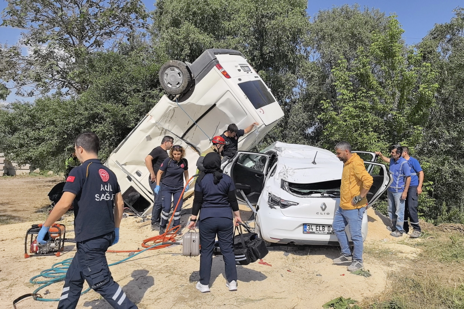 Şiddetli çarpmanın etkisiyle araçlar yaklaşık 20 metre sürüklendi ve minibüs takla atarak ters durdu. Kaza sonucu her iki sürücü ile otomobilde yolcu olarak bulunan Mine D. (28) yaralandı.