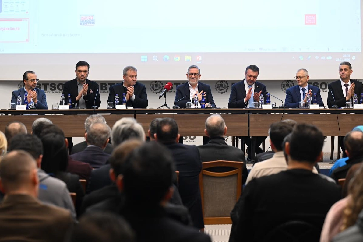 "BURSA'NIN KÜRESEL GÜCÜNÜ KORUMALIYIZ"Toplantının açılışında hitap eden BTSO Başkanı İbrahim Burkay, dünyanın köklü bir sermaye el değiştirmesine tanıklık ettiğini belirtti. Dönüşümü "yıkıcı" olarak tanımlayan Burkay, "Yapay zeka ve dijitalleşme ile birlikte sanayi devriminin çok ötesinde bir sürecin içindeyiz. BTSO olarak hedefimiz, bu değişimi en az hasarla atlatmak ve Bursa’nın önümüzdeki 50 yılda da küresel gücünü korumasını sağlamaktır." dedi. Makine sektörünün savunmadan havacılığa kadar her alanda "ayak izi" olduğunu hatırlatan Burkay, üretmeyen ülkelerin stratejik risklerini pandemi döneminden örneklerle paylaştı.