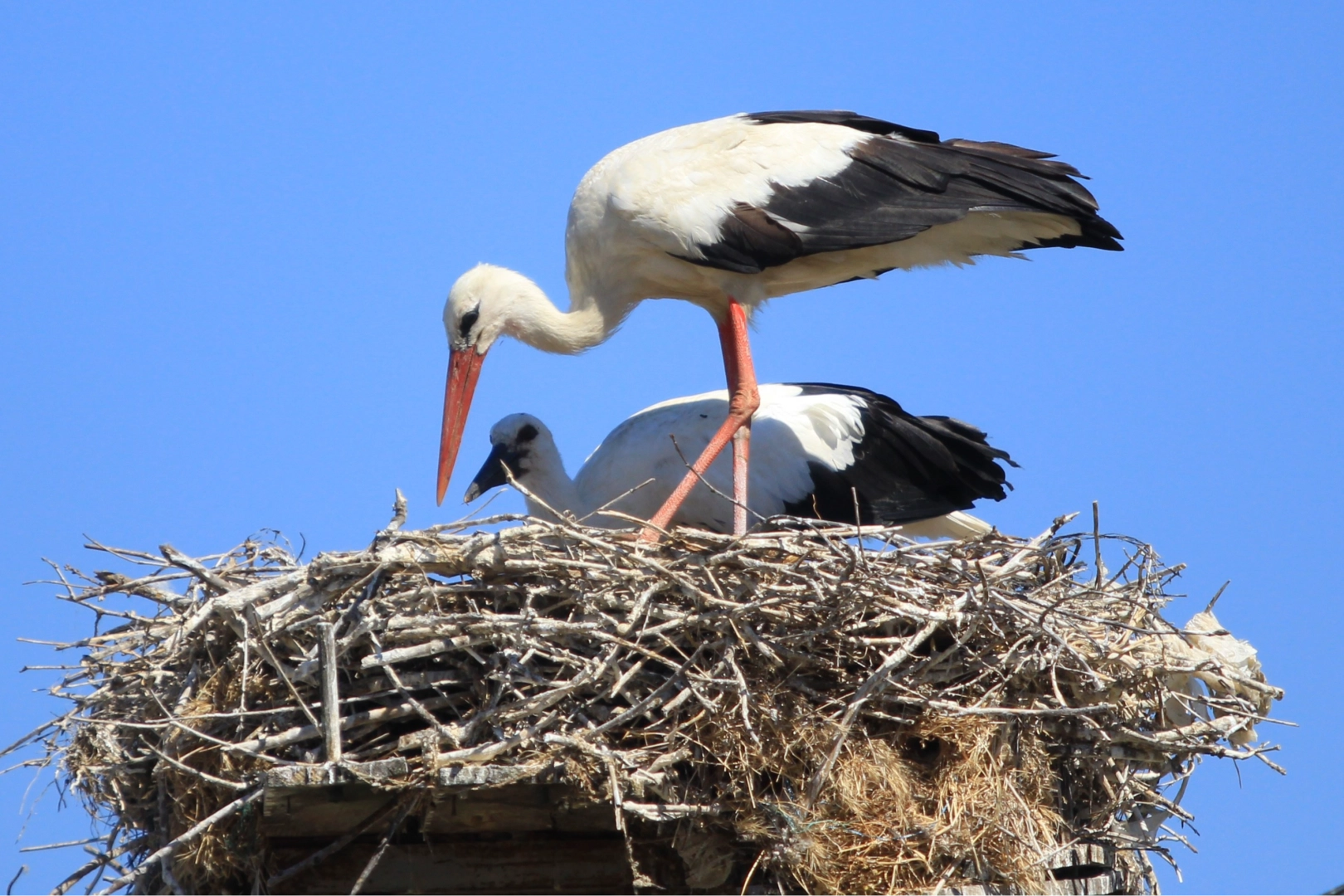Yumurtadan çıkan yavrular ve onları besleme telaşı içindeki anne ve baba leylekler, yiyecek bulmak için kanat çırparak mahallede adeta bir görsel şölen oluşturuyor.