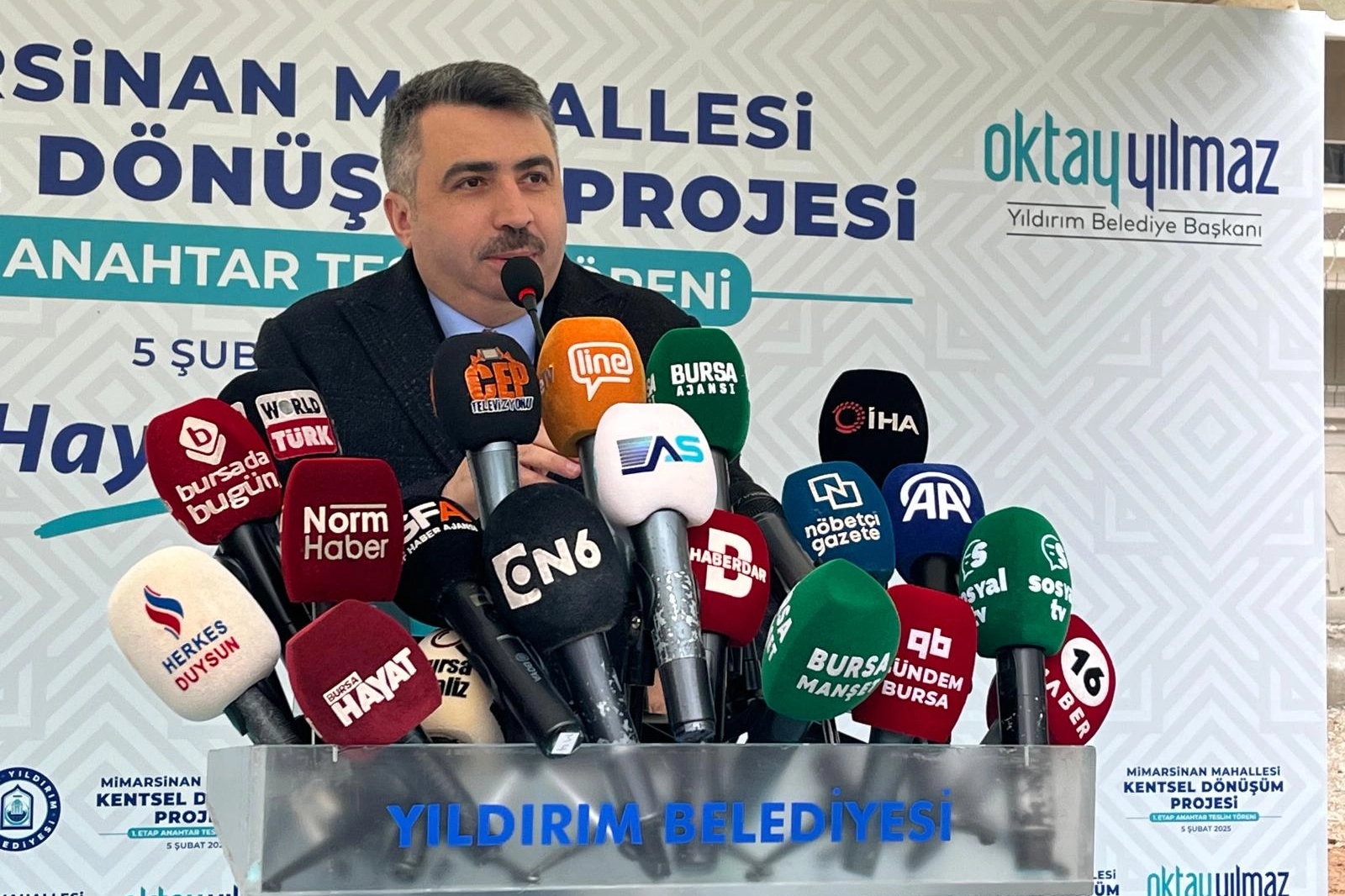 Yıldırım Belediyesi tarafından yürütülen Mimar Sinan Mahallesi 1. Etap Kentsel Dönüşüm Projesi tamamlanarak hak sahiplerine teslim edildi. Anahtar teslim töreninde konuşan Yıldırım Belediye Başkanı Oktay Yılmaz, ilçede gerçekleştirilen kentsel dönüşüm çalışmalarının önemine vurgu yaptı.