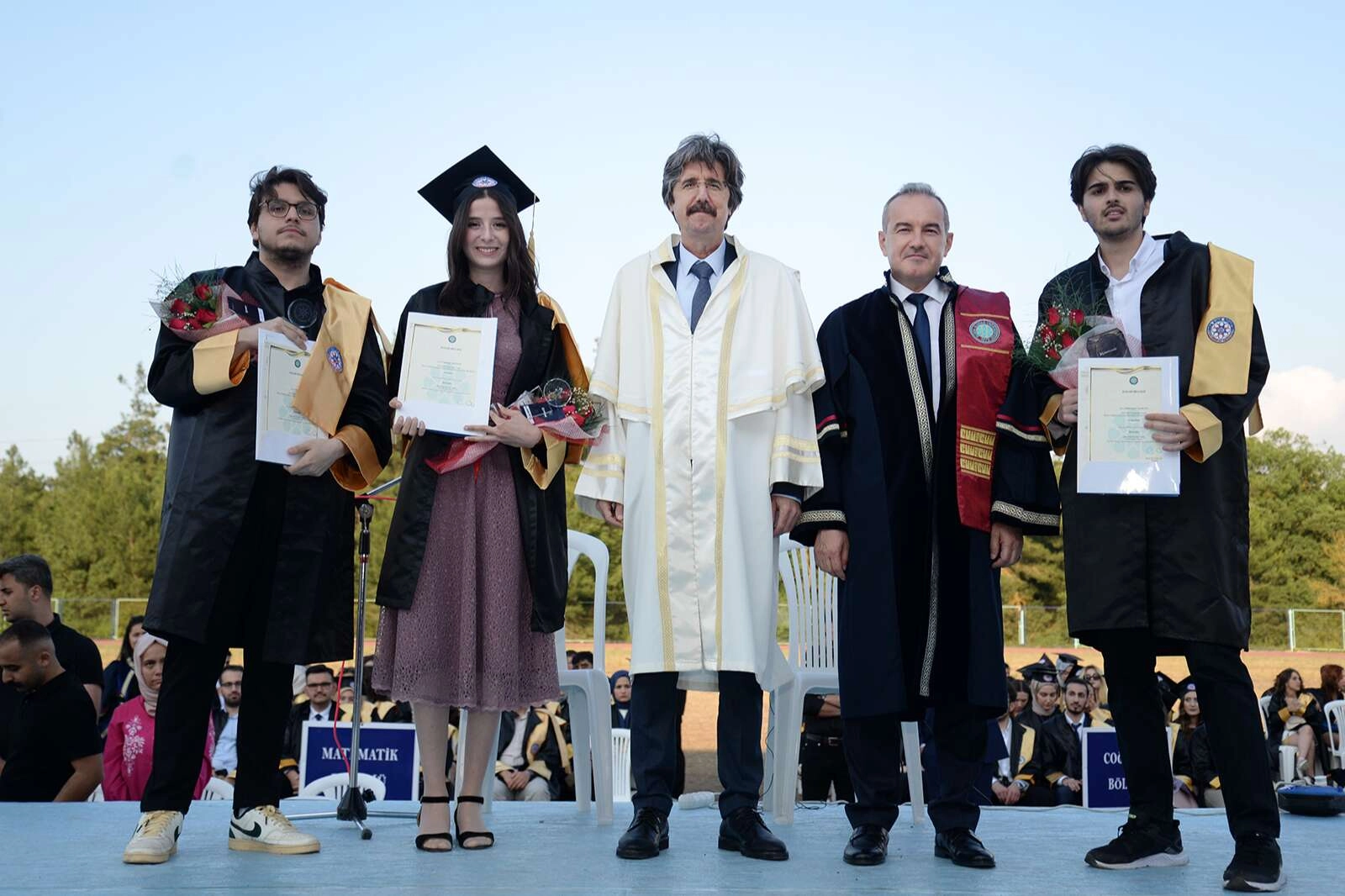 Fakülte birincisi, ikincisi ve üçüncüsünün ödüllendirildiği mezuniyet töreni, anı belgelerinin dağıtılması ve hep birlikte kep fırlatılmasının ardından tamamlandı.