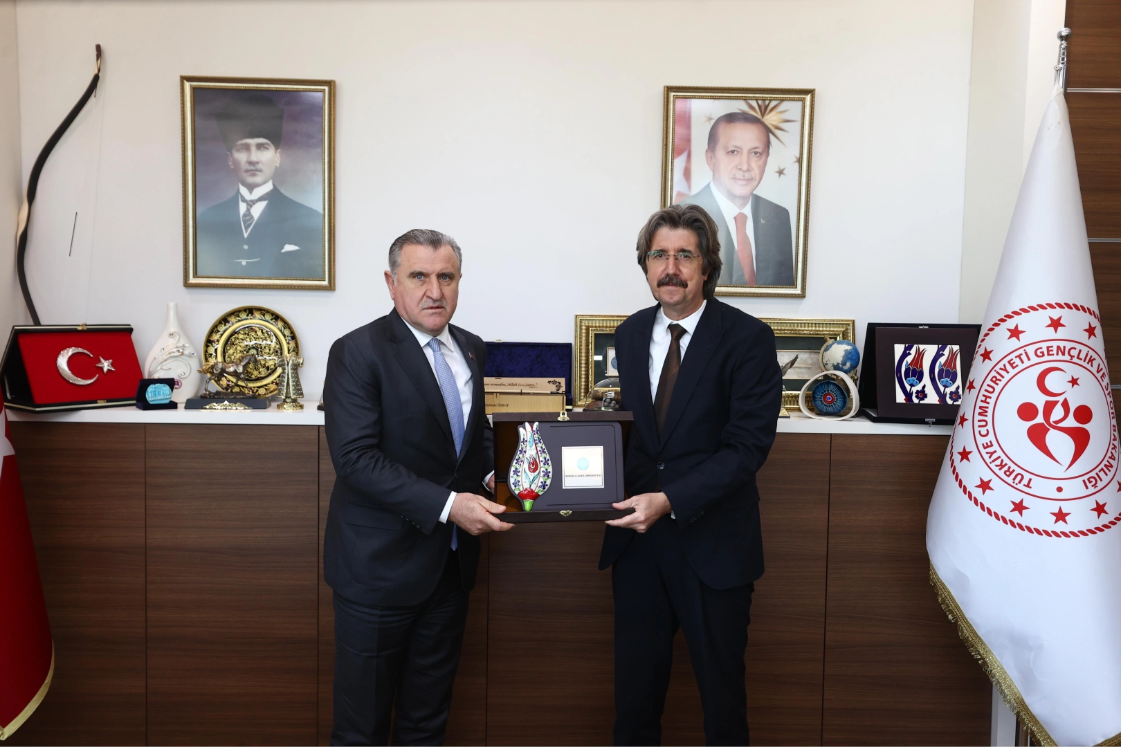 Gençlik ve Spor Bakanına ziyaret...Üniversite Yönetimimiz, Gençlik ve Spor Bakanı Osman Aşkın Bak’ı ziyaret etti. Proje ve çalışmaların aktarıldığı programda heyete Bakanlık üst düzey yöneticileri ve üniversitemiz mezunları da eşlik etti.https://t.co/o35eSga89e pic.twitter.com/OKMbwtXIAM