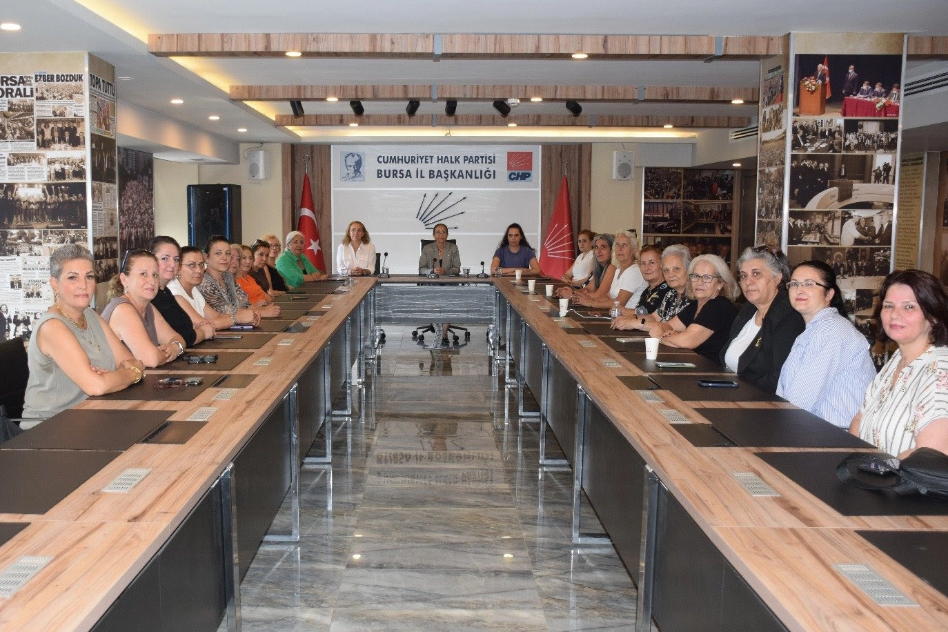 CHP Bursa İl Başkanlığı’nda düzenlenen basın toplantısına İl Kadın Kolları Başkanı Nigar Bölüker’in yanı sıra Kadın Kolları MYK Üyesi Fatma Özgür, ilçe kadın kolları başkanları ve yöneticiler katıldı.