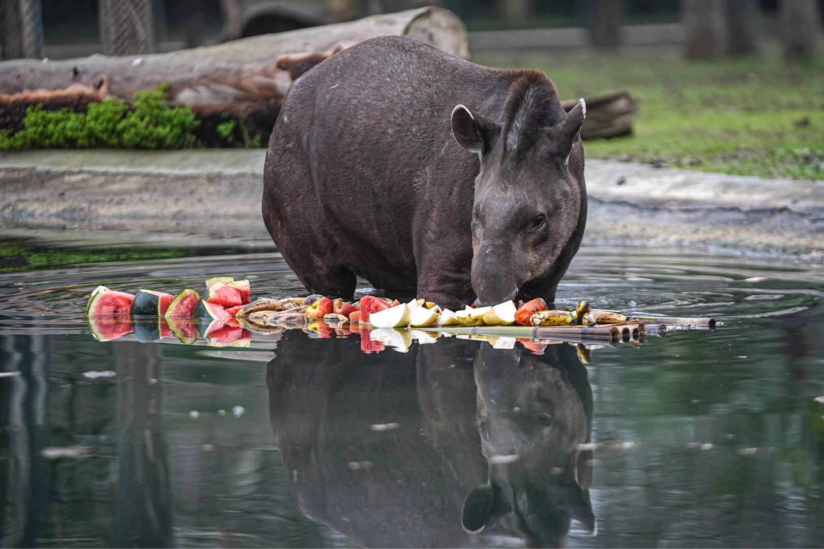 Üç yetişkin tapirin hem zihinsel hem de fiziksel aktivitelerini artırmak amacıyla, en sevdikleri mevsim meyveleri havuzun içine bırakıldı.