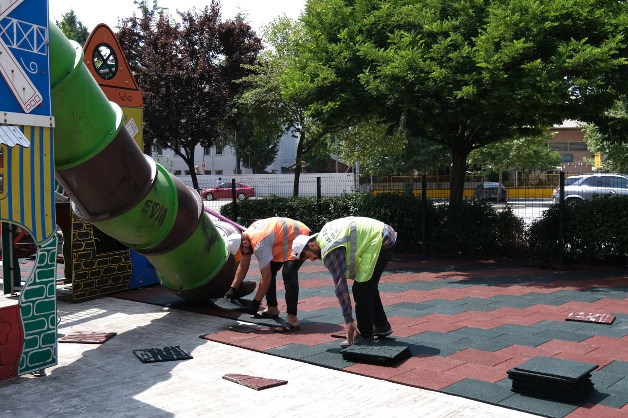 YAZ AYLARININ YOĞUNLUĞU GÖZ ÖNÜNE ALINDIÖzellikle yaz aylarında çocuk parklarında yaşanan yoğunluk dikkate alınarak planlanan bu çalışma ile miniklerin oyun oynarken olası düşme ve yaralanmalara karşı korunması amaçlanıyor. Kullanılan karo ve dökme kauçuk kaplama sistemleri, zemine hem güvenlik hem de estetik kazandırıyor.