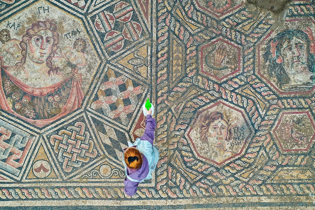 Mozaikte kullanılan teknik ve detaylara dikkat çeken Kahveci, “Her bir rengin 3-4 farklı tonuyla oluşturulmuş saç örgüsü motifleri, labirent ve Gordion düğümü gibi detaylar mozaiğin ustaca işlendiğini gösteriyor” dedi. Kullanılan tessera adı verilen yapı taşlarının taş, mermer ve camdan elde edildiği, merkezdeki figürlerde yarım santimetreküpe kadar indirilen küçük parçalarla çalışıldığı kaydedildi.