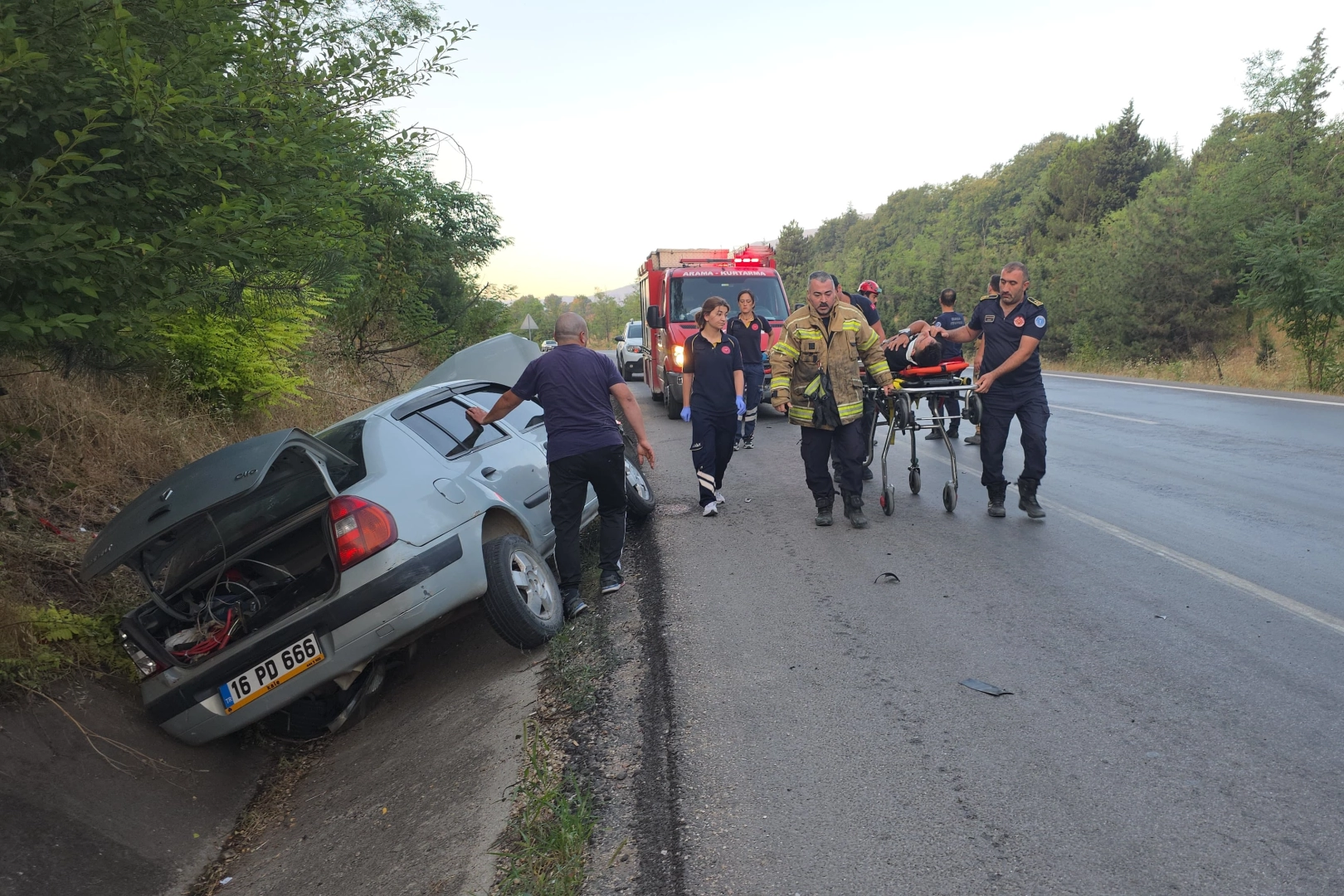 Kazada, araç sürücüsü Berat Ö. ile yanında bulunan 42 yaşındaki Mehmet Ö. yaralandı. Olay yerine sevk edilen sağlık ekiplerinin ilk müdahalesinin ardından yaralılar, İnegöl Devlet Hastanesi’ne kaldırıldı.
