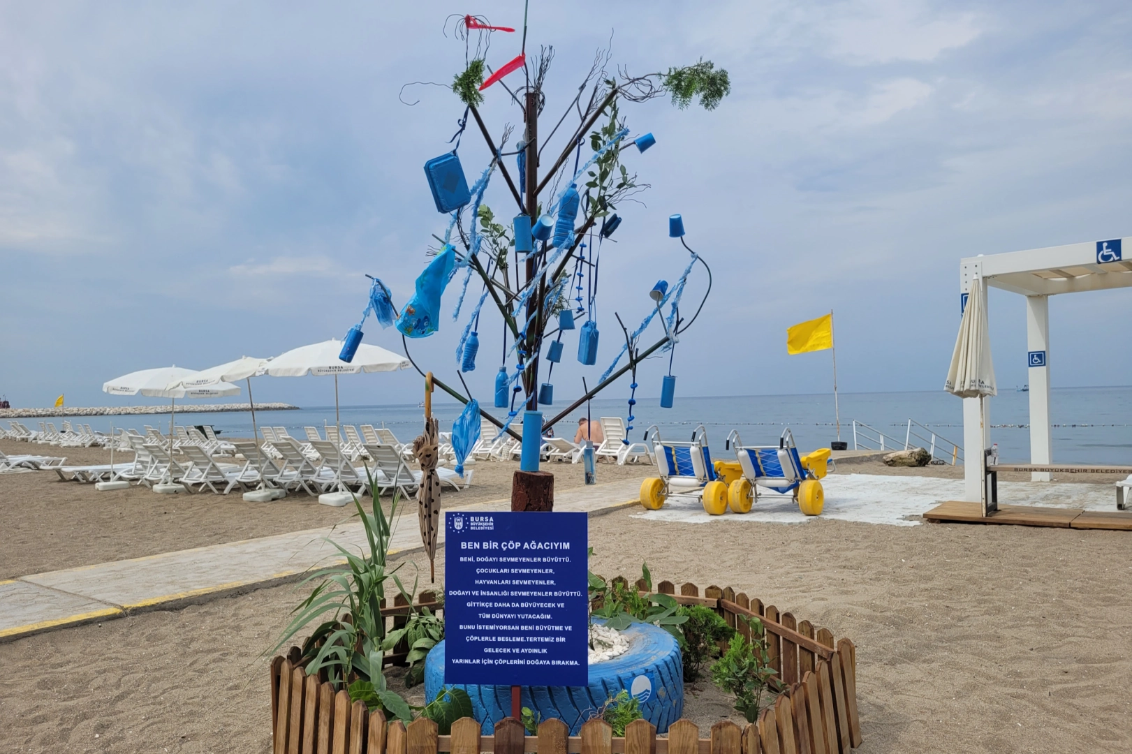 Karacabey Kurşunlu Halk Plajı’nda yürütülen temizlik çalışmalarında toplanan plastik atıklar, eski lastikler ve paletler, Bursa Büyükşehir Belediyesi’nin Park ve Bahçeler Dairesi Başkanlığı atölyelerinde işlenerek yeniden hayat buldu. Vatandaşların da katılımıyla geri dönüşüm temalı çöp ağacı oluşturulurken, sahilden çıkarılan lastikler renkli balık figürlerine dönüştürülerek duvarları süsledi.