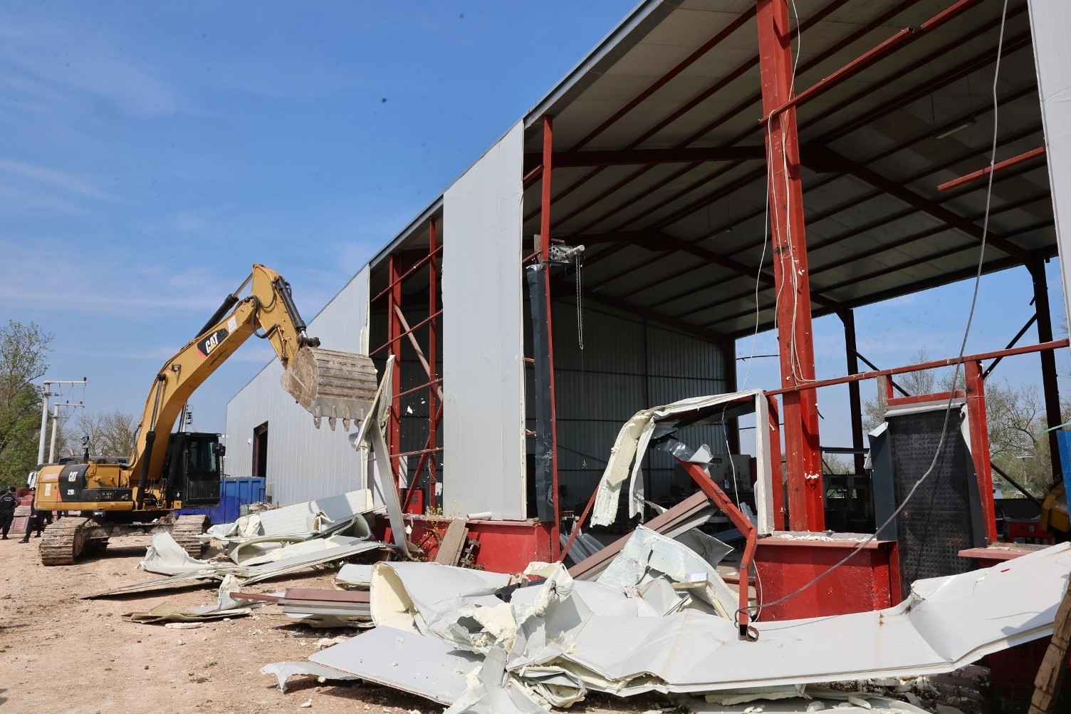 İki gün süren yıkım operasyonunda ilk adres olan Ürünlü’de toplam 2.200 metrekarelik bir iş yeri ve depo yıkıldı.