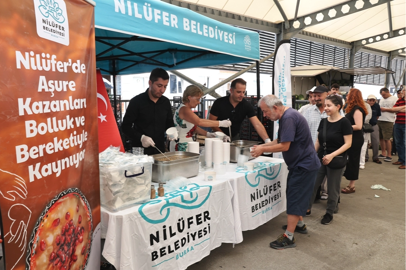 Nilüfer Belediyesi tarafından sürdürülen aşure geleneği bu yıl da devam ediyor. Muharrem ayında ilçe genelinde toplam 30 mahalledeki açık ve kapalı semt pazarlarında 18 gün boyunca 60 bin kişiye aşure dağıtılacak. Aşure ikramının ilk durağı Üçevler Semt Pazarı oldu. Başkan Yardımcısı Tezcan Öztürk, Meclis Üyesi Furkan Yavuz ve Üçevler Mahalle Muhtarı Sibel Uzun, aşure kazanının başına geçerek vatandaşlara aşure ikramında bulundu.