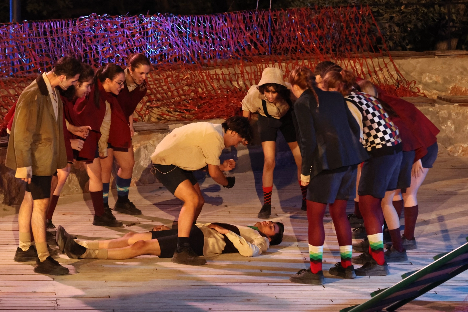 Ocak ayından bu yana süren kapsamlı eğitim sürecini başarıyla tamamlayan genç oyuncular, uçak kazası sonucu ıssız bir adaya düşen çocukların, uygarlıktan uzaklaştıkça içlerindeki ilkel dürtülerle yüzleşmelerini konu alan oyunu çarpıcı bir performansla sundu. M. Burak Dikilitaş tarafından uyarlanan ve Batuhan Pamukçu'nun yönetmenliğinde sahneye konulan oyunda; Aras Oymak, Başak Hançer, Berke Aydoğan Sancar, Beyza Ayten, Enes Tekin, Ezgi Aktan, Fatma Ruhenda Bayındır, Gülçin Vatan, Güneş Şahinkaya, Hüseyin Demirkıran, İlgi Ece Çakmak, Kayra Koktay, Melis Kiriş, Nehir Eren, Pınar İlhan, Selin Arabacı, Semiha Vatansever, Şebnem Çeliker, Şevval Çeliker ve Tuğçe Baksi gibi isimler rol aldı.