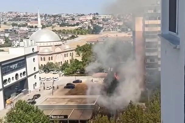 Yüksek katlı binaların arasında bulunan bir kafenin hemen yanında bulunan ağaçlar, henüz bilinmeyen bir nedenle aniden tutuştu. Alevler kısa sürede büyürken, çevredeki site sakinleri büyük bir panik yaşadı.