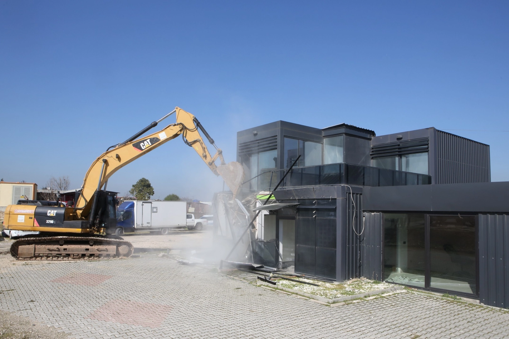 Yıkım çalışmaları kapsamında ilk olarak Demirci Mahallesi’nde tespit edilen 192 metrekarelik iki katlı ofis binası yıkıldı.