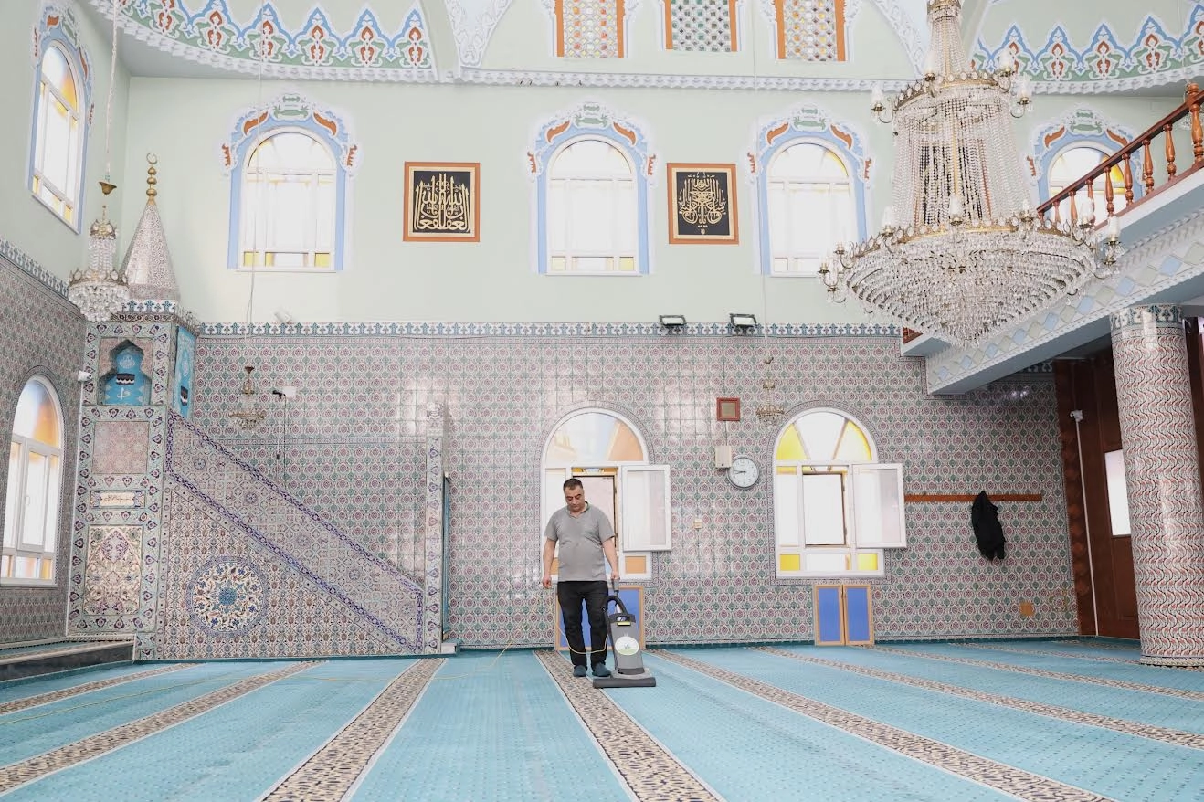 Temizlik çalışmaları kapsamında cami halıları, özel yıkama makineleri ve deterjanlı sularla derinlemesine yıkanıyor. Yüksek vakum gücüne sahip sistemlerle halılardaki kir, toz ve mikroorganizmalar arındırılırken, hızlı kuruma sağlayan teknoloji sayesinde ibadet alanları kısa sürede kullanıma açılıyor. Dezenfeksiyon işlemleriyle bakterilere karşı koruma altına alınan alanlar, çalışma sonunda sıkılan özel kokularla ferah bir atmosfere kavuşturuluyor.
