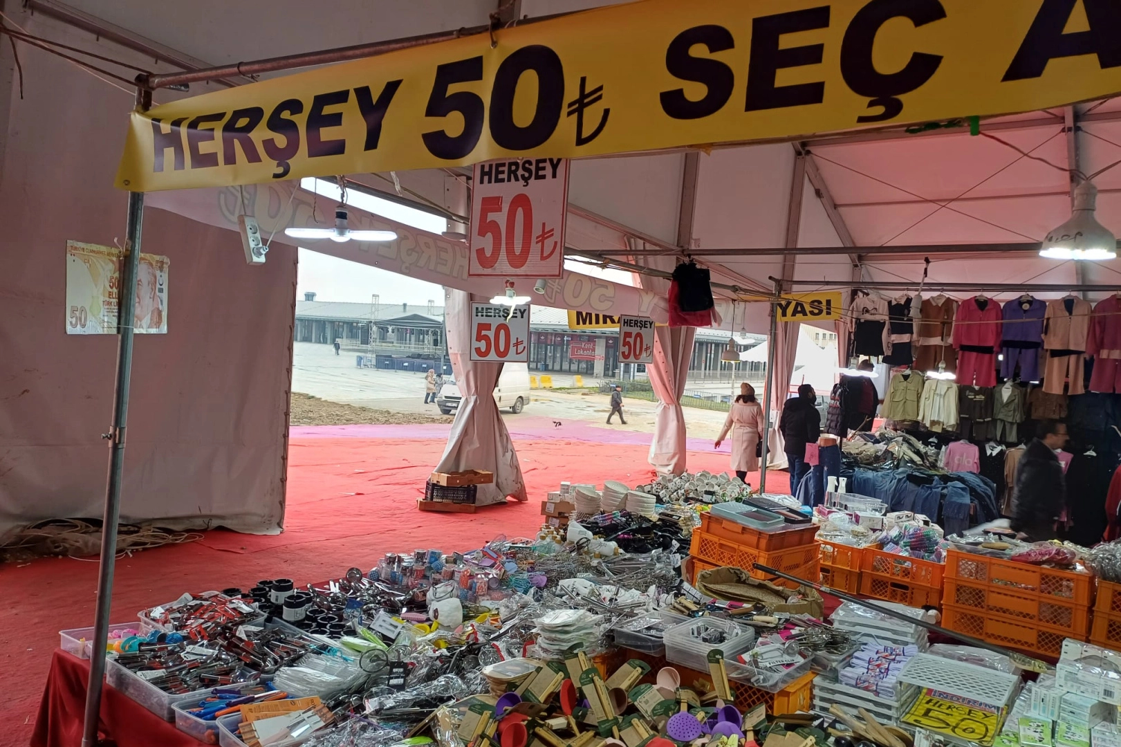 Osmangazi merkezinde bir çadır alanında faaliyete geçen indirim pazarı, mutfak gereçlerinden tekstile, küçük ev aletlerinden aksesuara kadar geniş bir ürün yelpazesini uygun fiyatlarla tüketiciye sunuyor. Ancak bu ticari hareketlilik, bölgedeki kalıcı esnaf ve yerleşik işletmeler arasında "haksız rekabet" iddialarını gündeme taşıdı.