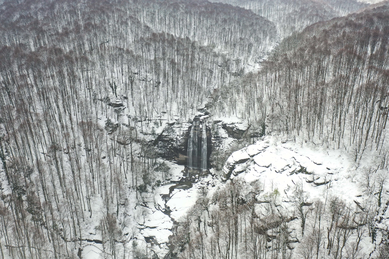 Suuçtu Şelalesi'nin çevresi, kışın beyaz örtüsüyle kaplanırken, dronla çekilen görüntüler, şelalenin eşsiz güzelliğini bir kez daha gözler önüne seriyor.