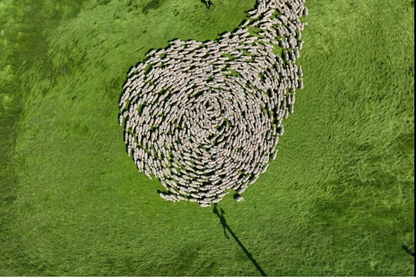 Gökyüzünden kaydedilen bu etkileyici kareler, doğayla uyum içinde sürdürülen hayvancılığın adeta görsel bir şölene dönüştüğünü ortaya koydu. Yaklaşık 20 bin küçükbaş hayvanın meralarda otlatıldığı işletmede, çobanların yönlendirmesiyle sürünün sergilediği uyumlu ve senkronize hareketler izleyenleri büyüledi. Özellikle çobanların kontrolüyle oluşan dairesel düzen, havadan bakıldığında adeta doğanın içinde sergilenen bir dans performansı gibi göründü.
