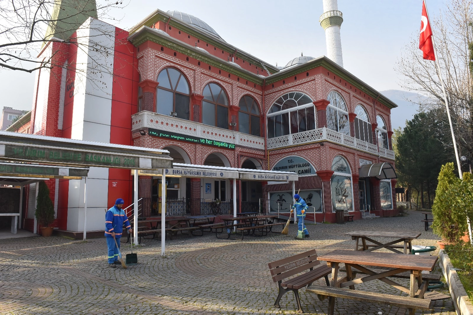 Yıldırım Belediyesi Temizlik İşleri Müdürlüğü ekipleri tarafından yürütülen çalışmalar kapsamında camilerin içi ve çevresi titizlikle temizleniyor. İbadethanelerin hijyenik koşullarda kullanılabilmesi için cami bahçeleri, oturma alanları, abdesthaneler ve şadırvanlar da dahil olmak üzere tüm alanlar detaylı bir şekilde dezenfekte ediliyor.