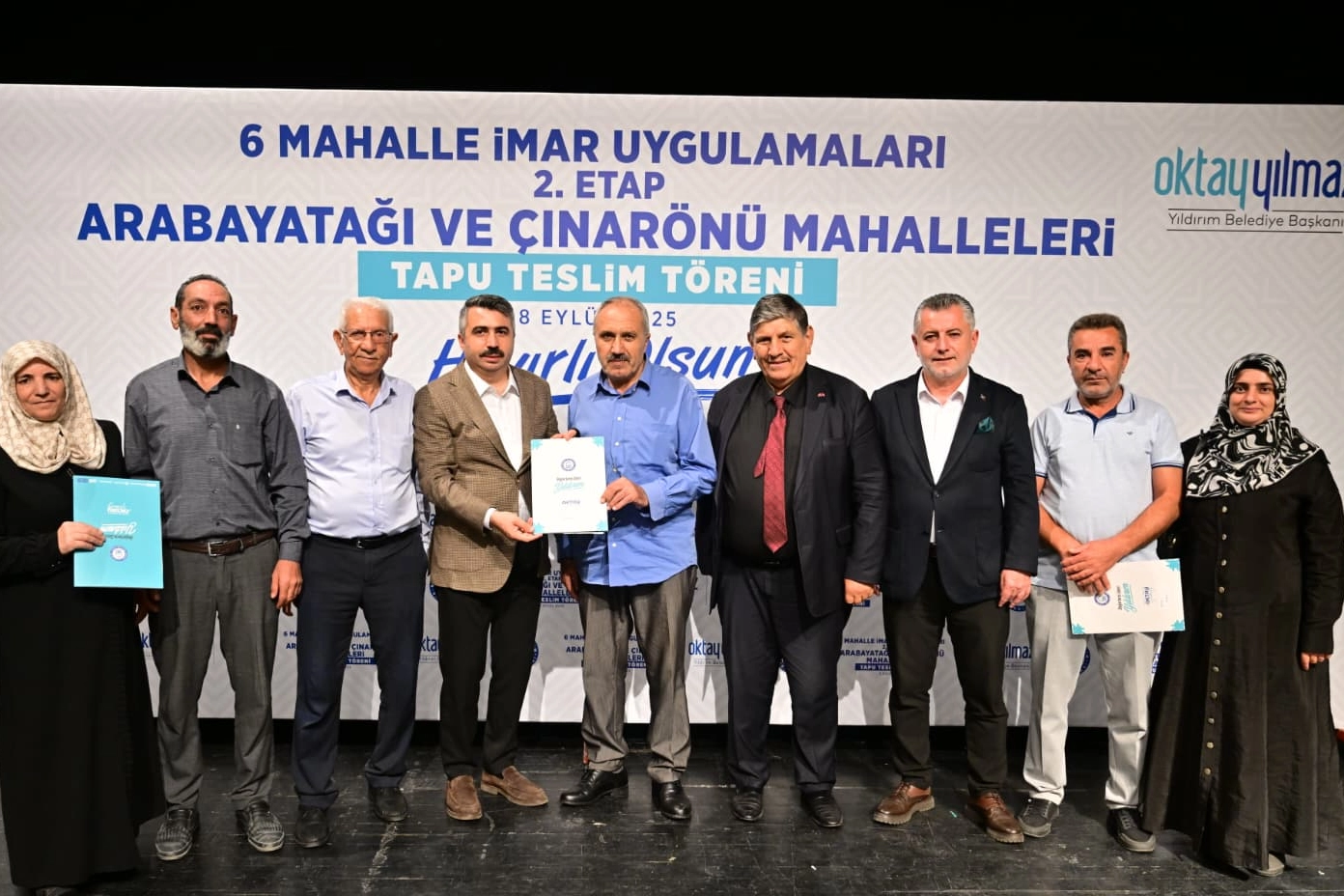 Yıldırım Belediyesi, mülkiyet sorunlarını çözmek ve ilçeyi daha planlı hale getirmek amacıyla yürüttüğü 6 mahalle imar uygulamalarında önemli bir aşamayı daha tamamladı. Bu kapsamda Arabayatağı ve Çınarönü mahallelerinde 4 bin 166 hak sahibi tapularına kavuştu.