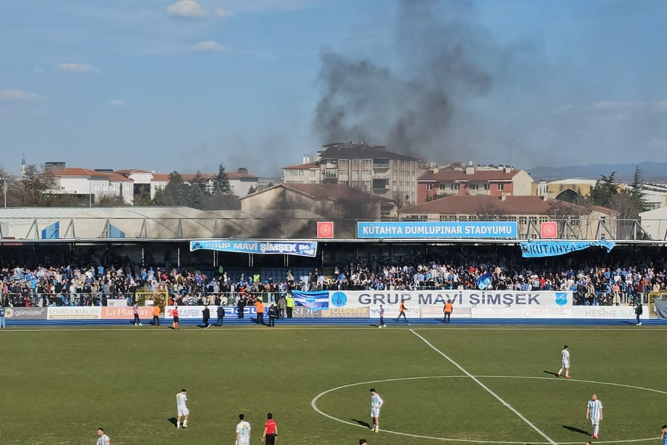 Karşılaşmanın hakemi, yangın nedeniyle oyunu derhal durdurdu. Olay yerine hızla gelen itfaiye ekipleri, tribündeki dumanların yükseldiği bölgeye müdahale ederek yangını kısa sürede kontrol altına aldı. Yangının nedeninin ise henüz netlik kazanmadığı bildirildi.