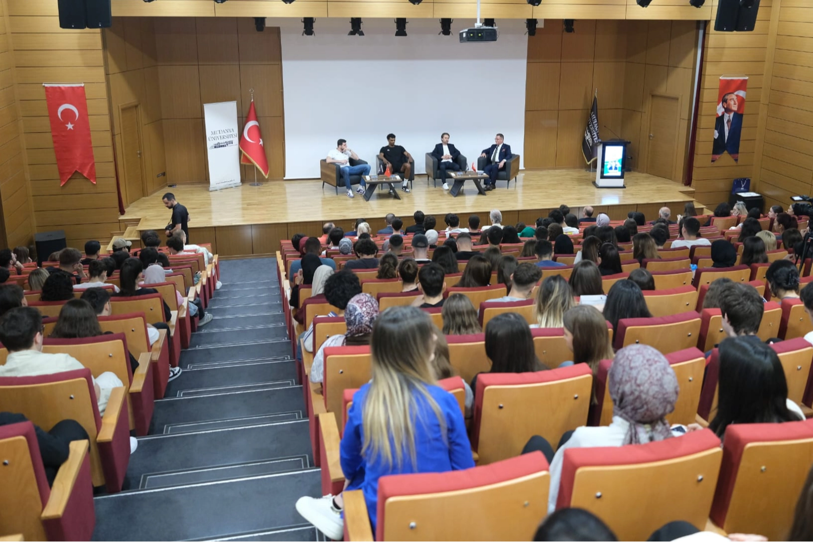 Mudanya Üniversitesi Konferans Salonu, Bursaspor Basketbol Takımı’nın önemli isimlerini ağırladı. Takım Başkanı Sezer Sezgin ve basketbolcular Berkay Candan ile Donte Gratham, üniversite öğrencileriyle gerçekleştirdikleri söyleşide hem sporun hem de hayatın önemli derslerine değindiler. Söyleşinin moderatörlüğünü Mudanya Üniversitesi Genel Sekreteri Ali Mollasalih üstlendi.