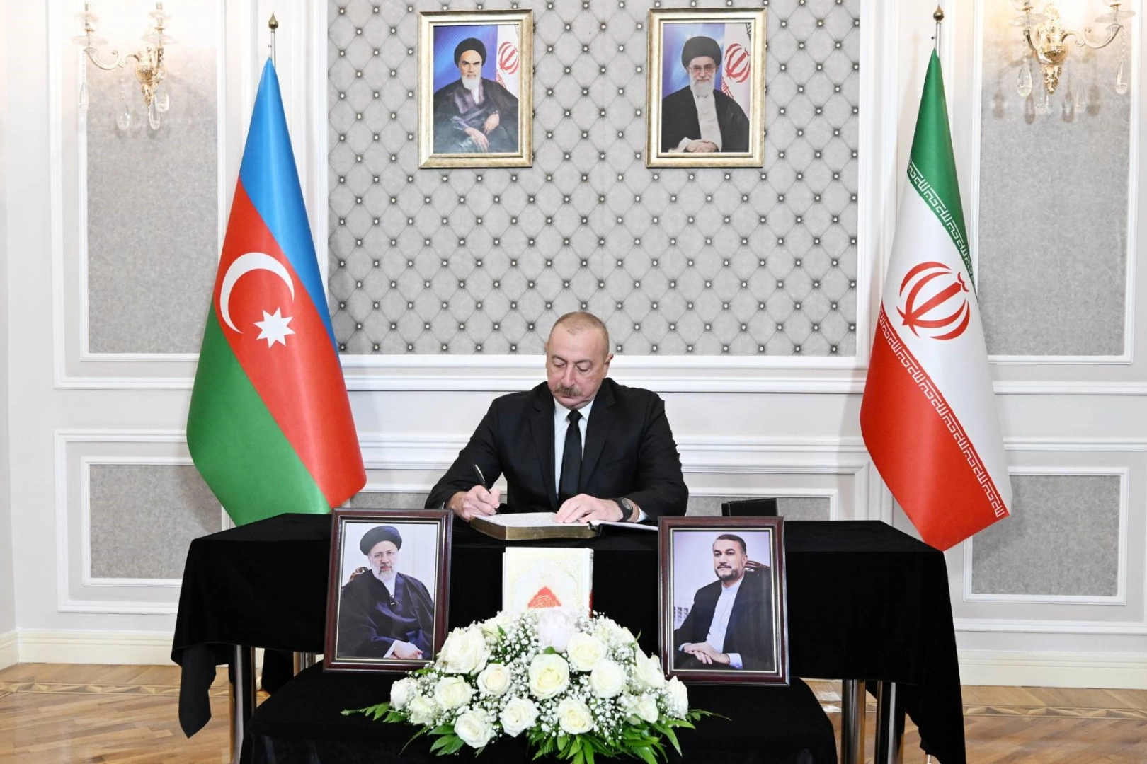 İran Cumhurbaşkanı İbrahim Reisi, İran Dışişleri Bakanı Hüseyin Emir Abdullahiyan ve heyetinin İran'ın Doğu Azerbaycan eyaletinde yaşanan helikopter kazasında hayatını kaybetmesinin ardından dünya liderleri İran’a taziyelerini iletiyor. Azerbaycan Cumhurbaşkanlığı'ndan yapılan açıklamaya göre İlham Aliyev, İran’ın Bakü Büyükelçiliğine taziye ziyaretinde bulundu. Aliyev, ziyaretinde büyükelçilikte açılan taziye defterini imzaladı.