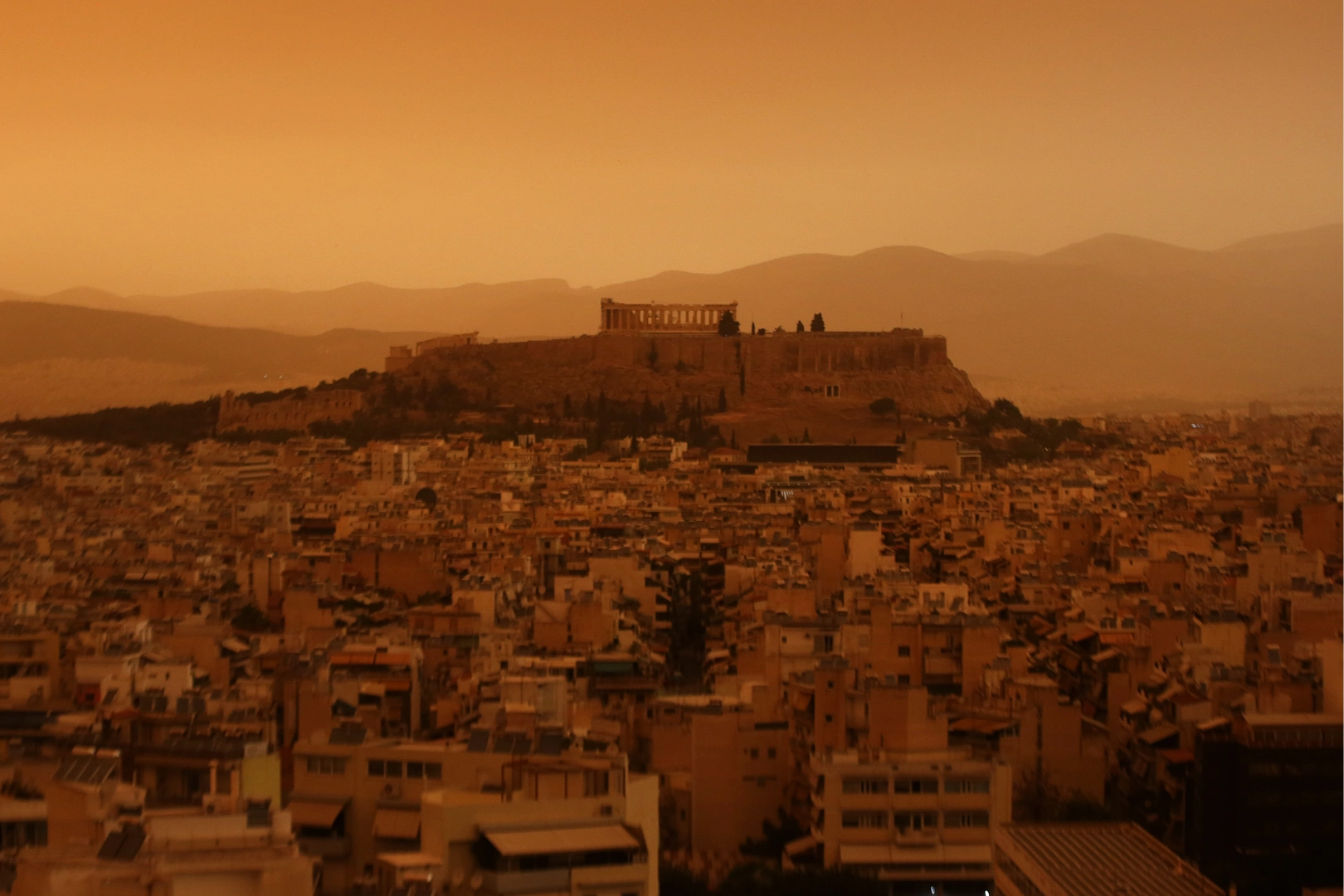 Atina’yı kaplayan çöl tozu nedeniyle gökyüzü turuncuya döndü. Atina’nın simgesi Akropolis de toz bulutlarının arasında kayboldu.
