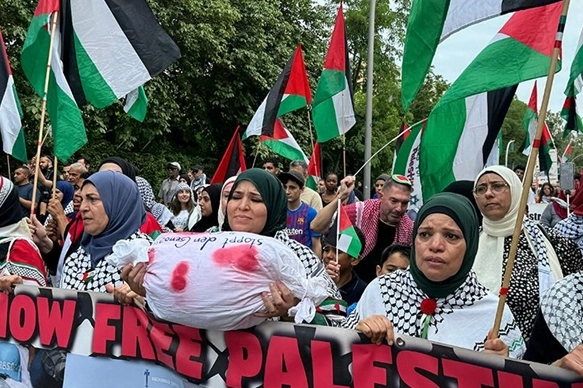 Almanya'yı İsrail'e verdiği destek nedeniyle eleştiren göstericiler, "Almanya finanse ediyor İsrail bombalıyor", "Soykırımı durdurun", "Gazze'nin işgaline hayır" yazılı döviz ve pankartlar taşıdı.