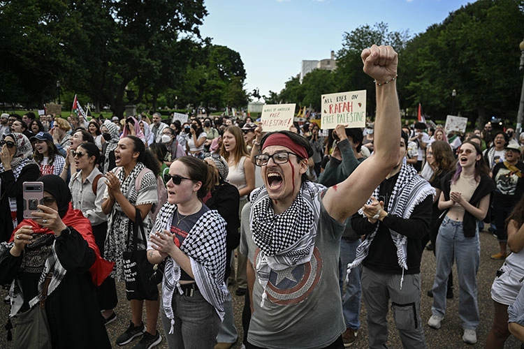 Göstericiler, Refah'taki çadır kampına düzenlediği saldırılarda sivillerin ölümüne neden olan İsrail'i "Gazze'deki soykırımına devam etmekle" suçlarken, İsrail aleyhine ve Filistin lehine sloganlar attı.