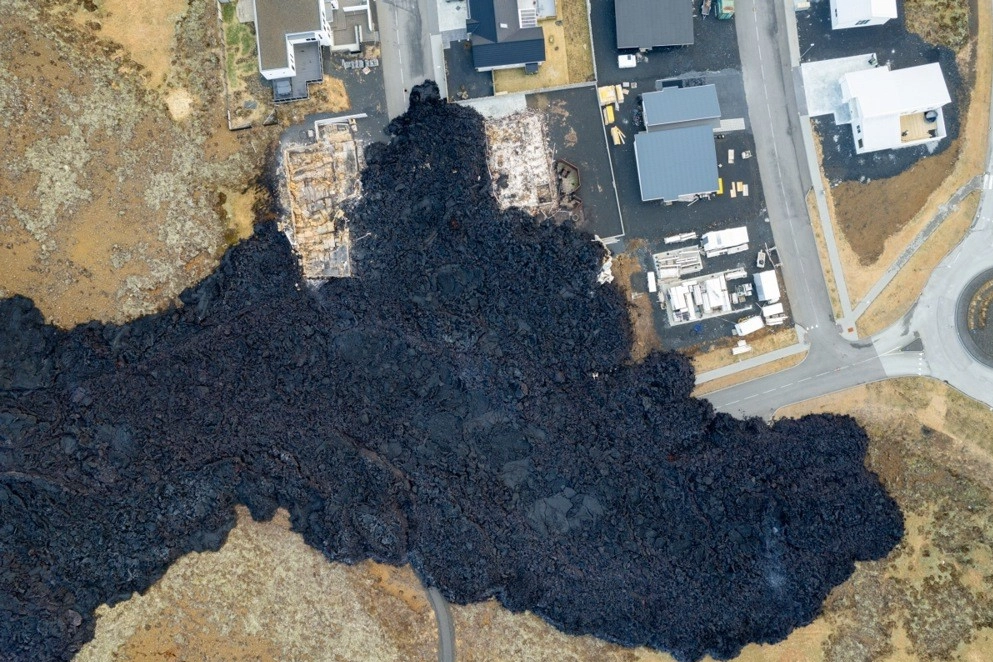 İzlanda’nın Reykjanes Yarımadası’nın Grindavik kasabası yakınındaki yanardağ dünden bu yana lav püskürtmeye devam ederken, yanardağdan kasabaya ulaşan lavlar havadan görüntülendi.