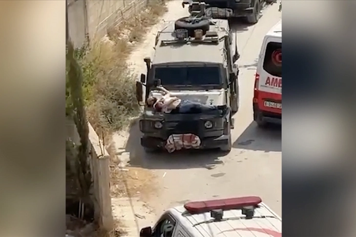 YARALI GENCİ, ASKERİ CİPİN KAPUTUNA BAĞLADILARFilistinli yaralı gencin askeri cipin kaput kısmına bağlanmış halde götürüldüğü görüntüler sosyal medyaya da yansıdı. Görüntülerde, askeri cipin, iki ambulansın arasından geçip gittiği görüldü.