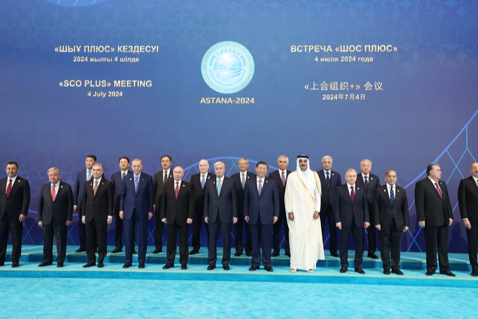 Kazakistan Cumhurbaşkanı Kasım Cömert Tokayev'in ev sahipliğinde "ŞİÖ +" formatında Bağımsızlık Sarayı'nda düzenlenen zirve öncesinde liderler, aile fotoğrafı için bir araya geldi.