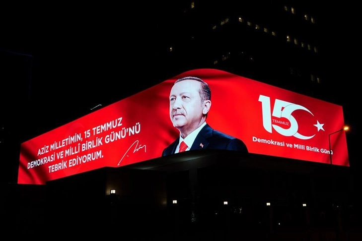 Cumhurbaşkanı Erdoğan'ın, "15 Temmuz Demokrasi ve Milli Birlik Günü'nü tebrik ediyorum." şeklindeki mesajı, Cumhurbaşkanlığı İletişim Başkanlığı binasındaki dijital ekranında gösterildi.