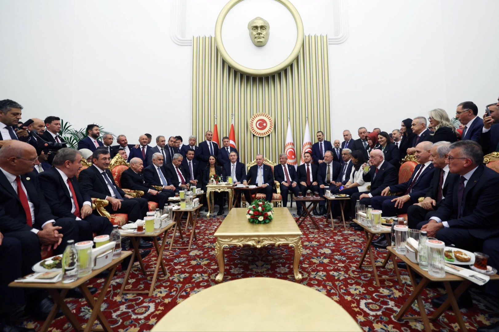SİYASİ PARTİLERİN MASALARINA ZİYARETResepsiyon sırasında Cumhurbaşkanı Erdoğan, Milliyetçi Hareket Partisi (MHP) Genel Başkanı Devlet Bahçeli’nin ve MHP milletvekillerinin bulunduğu masayı ziyaret etti. Daha sonra Halkların Eşitlik ve Demokrasi Partisi (DEM Parti) Eş Genel Başkanları Tuncer Bakırhan ve Tülay Hatimoğulları’nın yer aldığı masaya da uğrayan Erdoğan, kısa sohbetlerde bulundu.