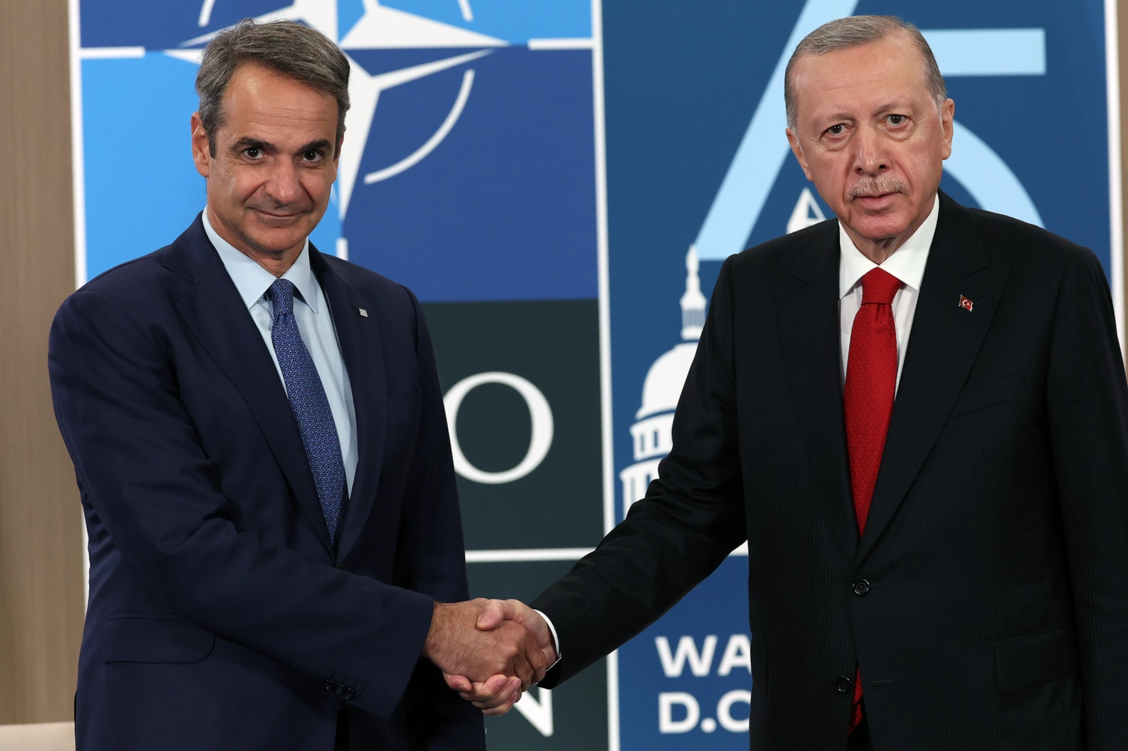 Cumhurbaşkanı Recep Tayyip Erdoğan, NATO Devlet ve Hükümet Başkanları Zirvesi'ne katılmak üzere geldiği ABD'nin başkenti Washington DC’de temaslarını sürdürüyor. Cumhurbaşkanı Erdoğan, zirve kapsamında Yunanistan Başbakanı Kyriakos Miçotakis ile zirvenin yapıldığı Walter E. Convention Center'da bir araya geldi.