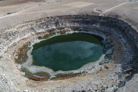Elips şeklindeki Timraş Gölü, 250 m ile 325 m çap, 30 m derinliğe sahip bir obruktur. Su yüzeyi ovadan 20 m aşağıdadır. Su derinliği 10–14 m arasında değişir.